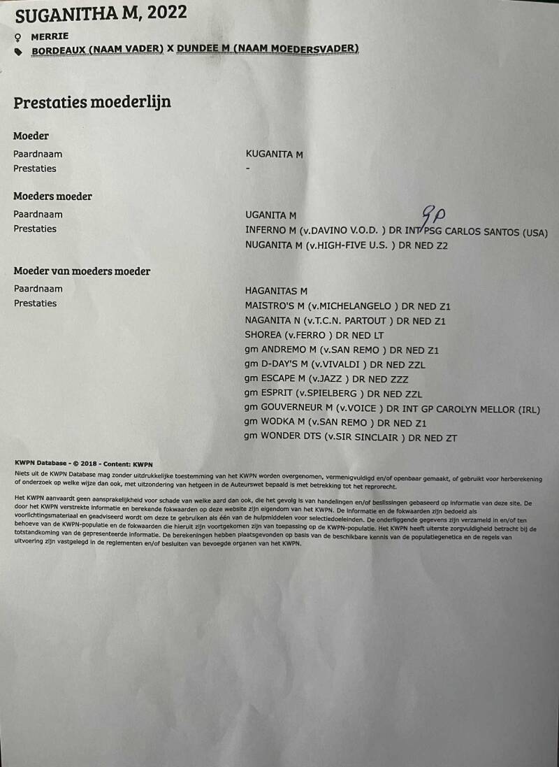 Deze knappe merrie uit het jaar 2022 heeft een stokmaat van 167cm en is een afstamming van Bordeaux X Dundee M.