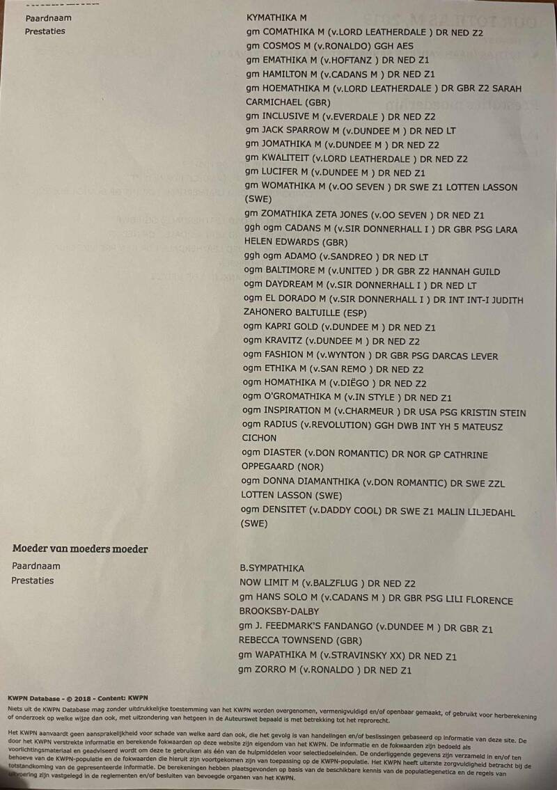 Zoals de naam al verraad is hij een nakomeling van de bekende Totilas. Hij heeft niet alleen een interessante vader maar ook een zéér interessante moeder namelijk de bekende Umathika M. Deze merrie bracht onder andere al 4 Zware Tour paarden. Dit is dus een paard uit een zeer presterende stam. Our Totilas M heeft in 2022 meegedaan aan de Hengstenkeuring en is daar toen aangewezen voor het verrichtingsonderzoek. Echter hebben wij later de keuze gemaakt om hem te castreren.